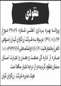 پروانه بهره برداری المثنی شماره مورخ مربوط به شرکت زرکاوان